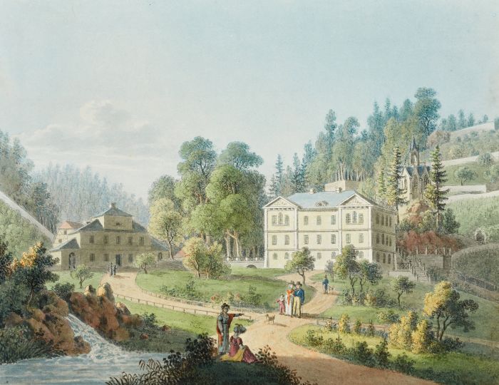 Prinz Friedrich August von Sachsen erwarb ab 1824 in Wachwitz am rechten Hang der Elbe bei Dresden Grundstücke, Weinberge und ein Landhaus, das er im italienischen Stil umbauen ließ. Nach seinem Regierungsantritt 1836 als König Friedrich August II. entwickelte sich Wachwitz zur Sommerresidenz der Wettiner, die hier regelmäßig ranghohe Gäste empfingen, wie Zar Nikolaus I. oder König Otto von Griechenland. Nach dem Tod des Königs bei einem Kutschenunfall in Tirol im Jahr 1854 wählte seine Witwe Maria Anna eine Tochter von König Max I. Joseph von Bayern, Wachwitz zu ihrem Witwensitz. 1890 wurde die alte Villa abgerissen und durch ein größeres Gebäude im Stil der Neorenaissance ersetzt. - Johann Friedrich Wizani studierte ab 1787 an der Dresdner Akademie bei Adrian Zingg und Johann Friedrich Veith. Er spezialisierte sich auf Landschaftsansichten und schuf hauptsächlich Ansichten aus der Umgebung von Dresden. Von ihm stammt auch ein Gegenstück mit Ansicht der Villa von der anderen Seite mit Blick in das Elbtal (vgl. Katalog Robert Wölfle "Kunst auf Papier", 2019, Nr. 18). - Aus einem adeligen Album. Blütenfrisch erhalten.