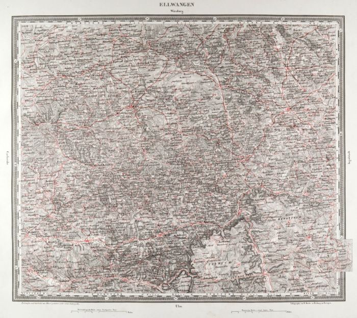 Zeigt das Gebiet zwischen Esslingen, Backnang, Ingelfingen, Dinkelsbühl Bopfingen und Göppingen. Die Strassen und Eisenbahnlinien in Rot gedruckt.