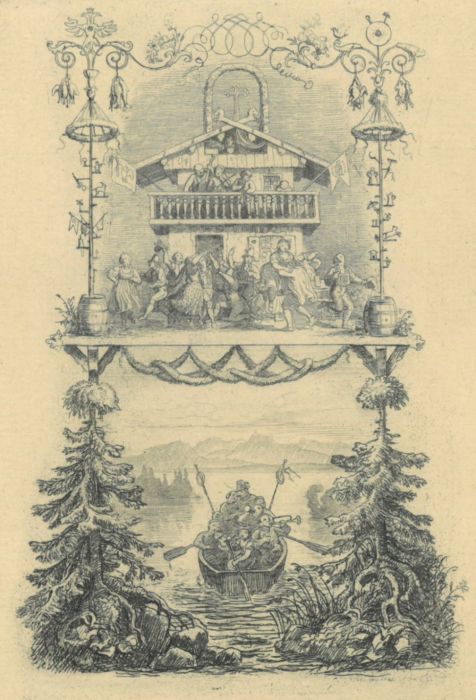 EUGEN NAPOLEON NEUREUTHER (1806 - 1882). - Bauernhochzeit, mit Tanz vor einem Wirtshaus oben und fröhlicher Kahnfahrt unten.
