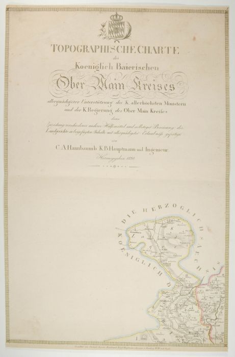 J. Heller, Verzeichnis von bambergischen topographisch-historischen Abbildungen, Bamberg 1841, S. 16, Nr. 120: "Diese ist bis jetzt die größte über den Obermainkreis erschienene Karte". - Die übergroße, grenzkolorierte Karte zeigt das Gebiet des Oberhauptkreises von Lauenstein im Norden bis Herzogenaurach im Süden und westlich von Ebersbrunn bis in die Tirschenreuther Umgebung im Osten. - 8 nicht zusammengesetzte Teile. - Nur wenig fleckig, ein Teil mit papiergedecktem Siegel. - Die große Wandkarte in guter Erhaltung.