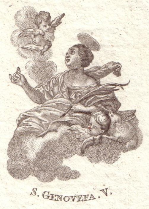 GENOVEFA. - S.Genoveva.V. Halbfigur nach links auf Wolken mit Ring, Palme und Lamm, dazu drei Putten.
