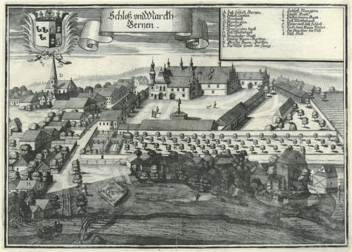 GERZEN. - Schloß und Marckh Gertzen. Dekorative Ansicht von Schloß und Ort aus der Vogelschau.