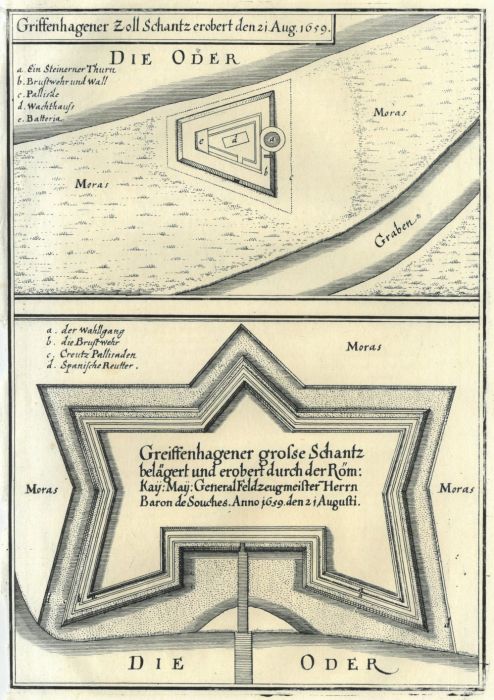 Darunter: "Greiffenhagener große Schantz belägert und eröbert durch der Röm: Kay: May: General Feldzeugmeister Herrn Baron de Souches". Befestigungsplan. 14 x 18 cm (Fauser 4977). Zwei Ansichten auf einem Blatt.