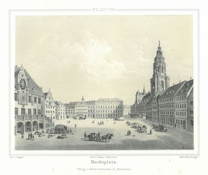 HEILBRONN. - Marktplatz. Reich belebte Ansicht mit dem Rathaus links und der gegenüberliegenden Kirche.