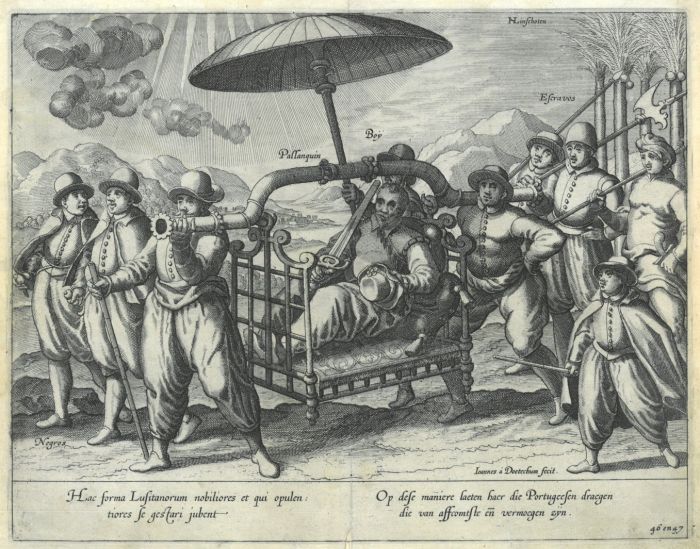 Thieme-Becker Bd. XXIII, S. 257, und Bd. IX, S. 378 . - Aus "Itinerario ofte Schipvaert van J.H.v. Linschoten naer Oost ofte Portugaels Indien" etc. - Ein reicher portugiesischer Kolonialherr liegt mit gezogenem Schwert auf einem Tragesessel bzw. -bett (Pallanquin), begleitet von Dienern (Escravos, Negros) und bewaffneten Leibwächtern, ein "Boy" hält den Sonnenschirm, dahinter die Landschaft, unten Inschrift. Linschoten bereiste Indien 1583 bis 1589.