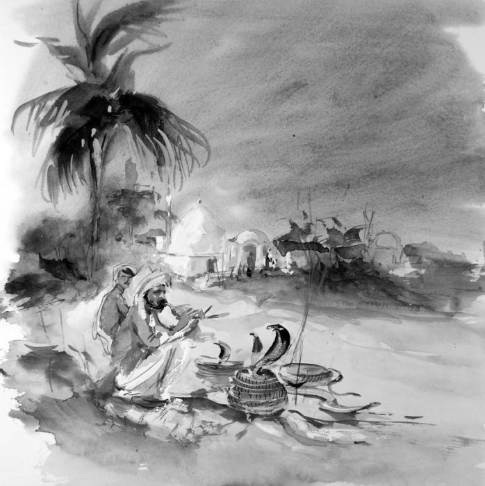 Blick auf einen Meeresstrand, vorne hockt ein rotgewandeter Schlangenbeschwörer mit Turban und spielt auf seiner Flöte, wobei sich drei Schlangen aus ihren Körben emporwinden, dahinter Palme und Behausungen.