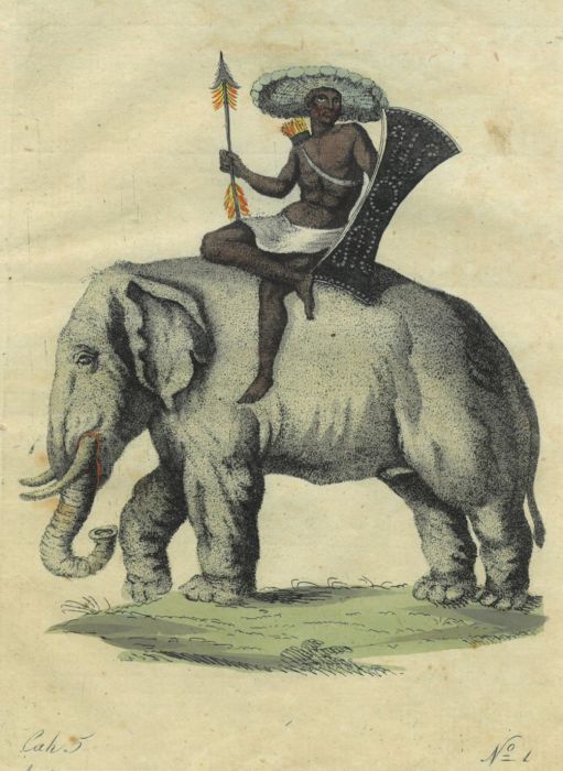 Eingeborener Krieger von den Molukken (Harafora, Alfurier), der auf einem Elefanten reitet.