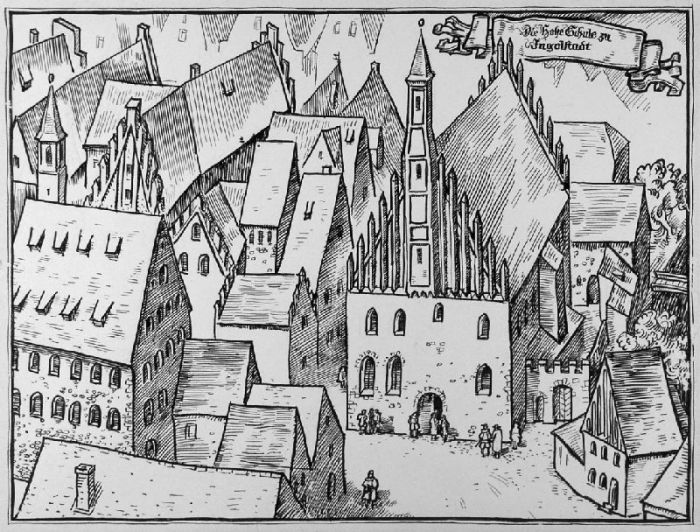 Die Hohe Schule zu Ingolstadt. Ansicht mit den umliegenden Häusern von einem erhöhten Standpunkt aus.