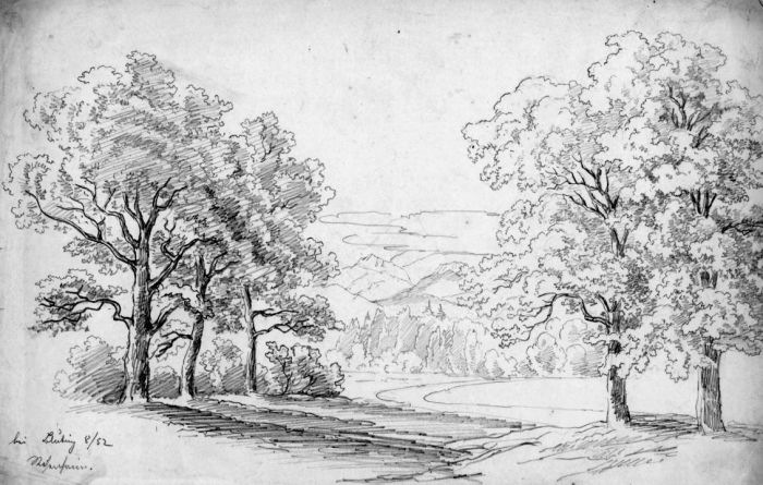 Seitlich in den Rändern etwas angestaubt und fingerfleckig. - Beiliegen zwei Blätter mit Bleistiftzeichnungen, jeweils bez. "bei Bluting" und dat. wie oben, jeweils baumbestandene Landschaften mit Bergen im Hintergrund, 19 x 33,5 cm bzw. 16 x 21 cm, das kleinere Blatt auch verso mit ähnlicher Landschaft. Insgesamt vier Darstellungen auf drei Blättern.