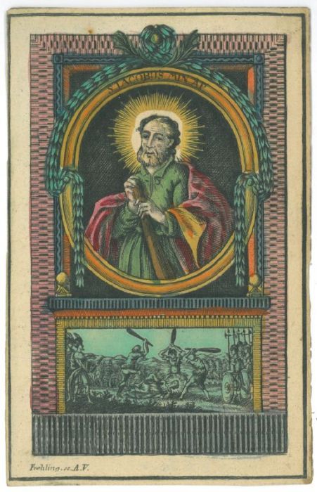 JAKOBUS der Jüngere. - Hüftbild nach halblinks im Schriftoval mit Festons des Apostels mit Keule in Händen, im Sockel sein Martyrium.