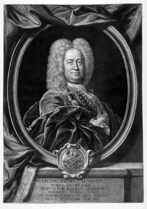 JENISCH, Wolfgang Jakob (1682 - 1728). - Halbfigur nach viertelrechts im drapierten Oval des Kämmerers und Geheimen Rats von Kempten, unten Wappen und Inschrift.