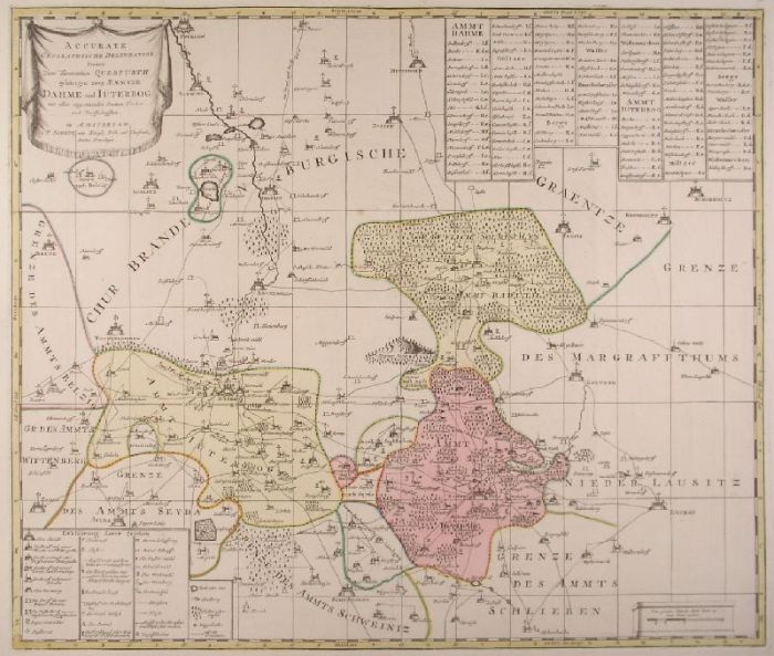 Die flächenkolorierte Karte zeigt die Ämter Dahme und Jüterbog mit der Grafschaft Baruth in dem Gebiet Seyda, Potsdam, Luckau und Märkisch Buchholz. Links oben Titelkartusche, in den anderen Ecken Erklärungen und Ortssuchregister bzw. Meilenzeiger.