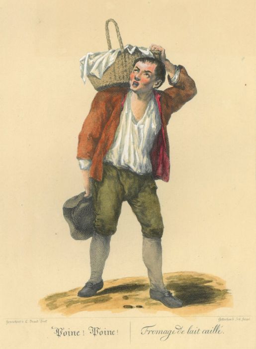 KÄSE. - Verkauf. - Poine! Poine! Fromage de lait caillé. Wiener Käseverkäufer in voller Gestalt und typischer Kleidung und einem Käsekorb auf der Schulter.