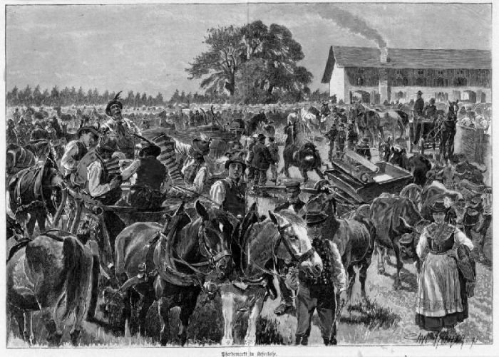 Pferdemarkt in Keferloh. Zahlreiche Personen mit Pferden und Kutschen vor dem Gutshof.