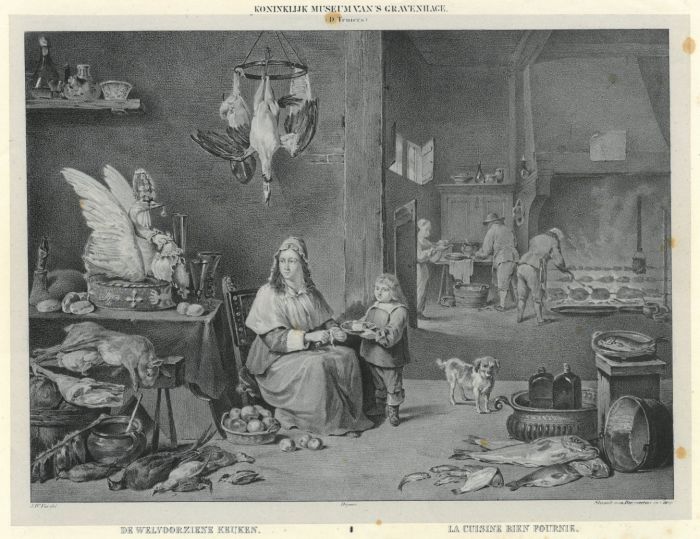 De welvoorziene Keuken. La Cuisine bien Fournie. Blick in eine gutausgestattete große Küche, eine Frau (Teniers Frau Anna) sitzt und schält Äpfel während rechts von ihr ein Junge (der älteste Sohn David des Künstlers) mit Teller steht. Links auf dem Tisch ein Schwan-Kuchen, im Hintergrund zwei Köche beim Zubereiten von Geflügel am großen Kamin. Im Vordergrund liegen Geflügel, Wild und Fische.