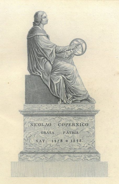 KOPERNIKUS, Nikolaus (1473 - 1543). - Nicolao Copernico grata patria. Ganzfigur im Profil nach rechts des Astronomen, sitzend mit Armillarsphäre.