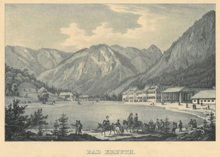 KREUTH. - Ansicht des Bades, links im Hintergrund die Kapelle, im Vordergrund große Reisegesellschaft.