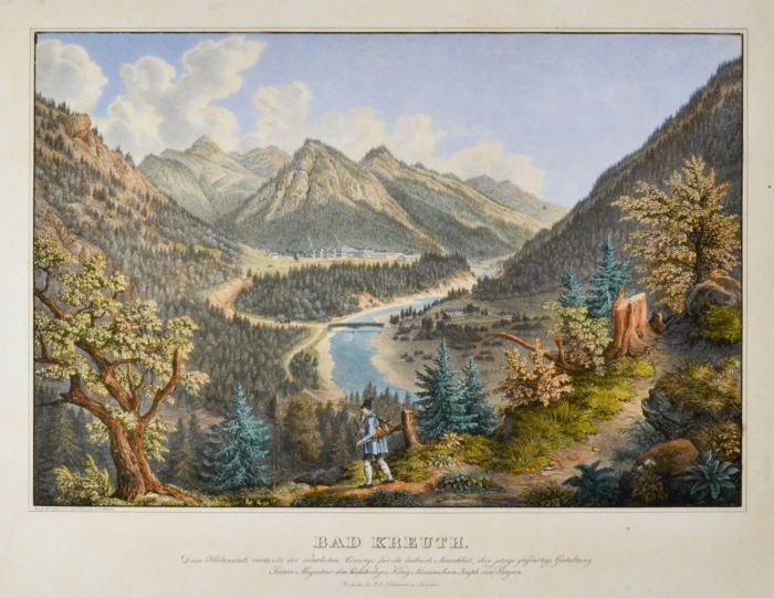 KREUTH. - Bad Kreuth. Blick von Nordosten über die Weissach auf die Kuranstalt, im Hintergrund die Berge, vorne ein Jäger mit Gemse auf dem Rücken.