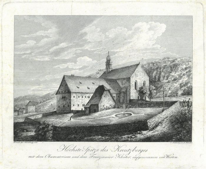 Höchste Spitze des Kreutzberges mit dem Observatorium und dem Franziskaner Kloster, aufgenommen von Westen.