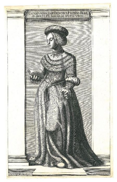 KUNIGUNDE von Österreich, Herzogin von Bayern (1465 - 1520). - Ganzfigur nach dreiviertellinks der Gemahlin Herzog Albrechts IV. von Bayern und Tochter Kaiser Friedrichs III., mit einem Buch in der Hand.