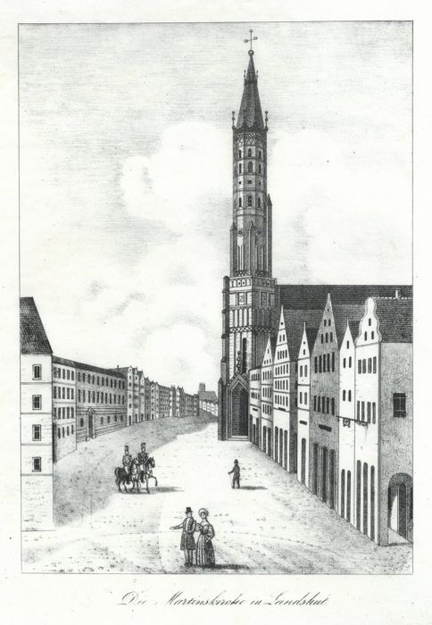 LANDSHUT. - Die Martinskirche in Landshut. Straßenansicht mit Kirche.