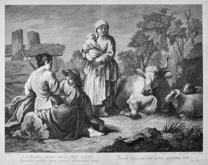 O fortunatos nimium etc. Bauernfamilie bei der Rast mit Schafen und einem Rind. "O rus, quando ego te aspiciam" etc. Bauernfamilie vor ihrem Haus mit Schafen und einem Rind. Gegenstücke.