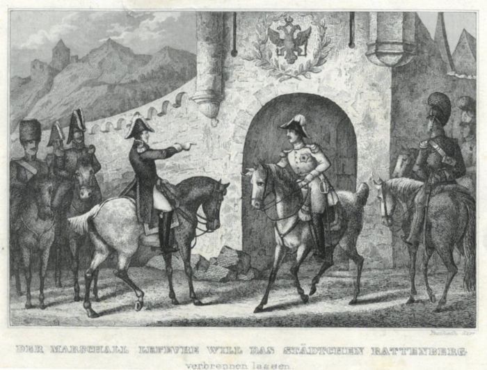Der Marschall Lefevre will das Städtchen Rattenberg verbrennen lassen. Der Marschall zu Pferde vor dem Stadttor, dazu berittene Suite, unten Inschrift. - Oben hinterlegte Randläsur.