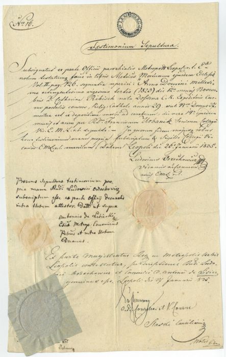 LEMBERG. - Urkunde. - Begräbnisurkunde für Catharina Ribisch, geborene Dossena, Postbotengattin, mit drei Unterschriften und gedeckte Siegel des Metropolitankapitels (2) und des Vizebürgermeisters (1).