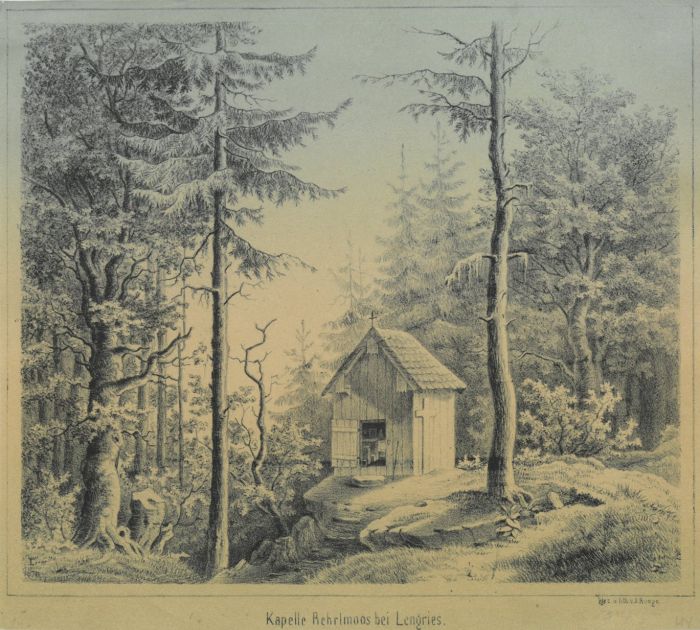 LENGGRIES. - Kapelle Rehrlmoos bei Lengries. Kleine Holzkapelle auf einem Felsen im Wald.
