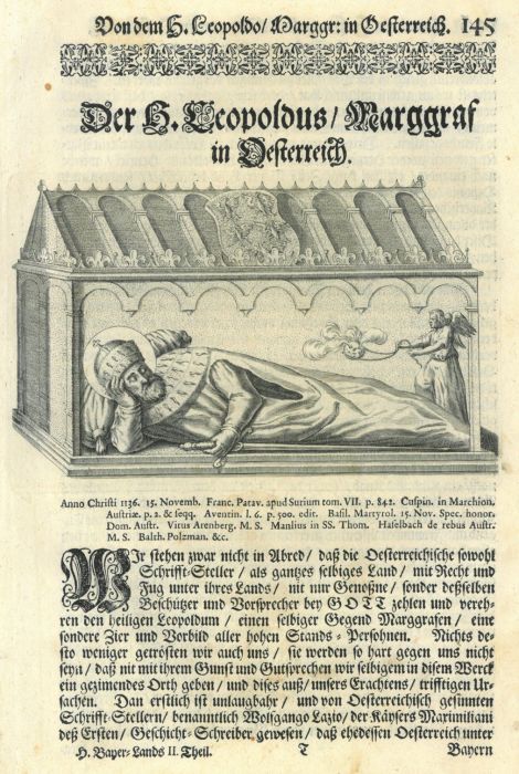 LEOPOLD III., Markgraf von Österreich (1075 - 1136). - Ganzfigur en face des verstorbenen Babenbergers, liegend im Hermelin mit Fürstenhut in seinem Sarkophag, rechts ein Engel mit Weihrauchfaß.