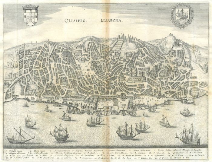 Olisippo. Gesamtansicht aus der Vogelschau mit Segelschiffen im Vgr., am Unterrand Legende, oben zwei Wappen.