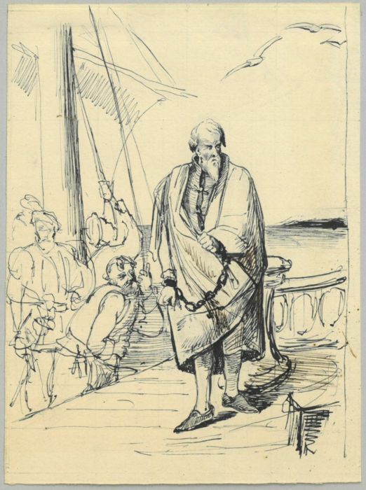 Mann in Ketten. Ein älterer Mann, der an den Händen mit einer Kette gefesselt ist, steht an einem Landungssteg, hinter ihm sieht man Matrosen auf einem Segelschiff.