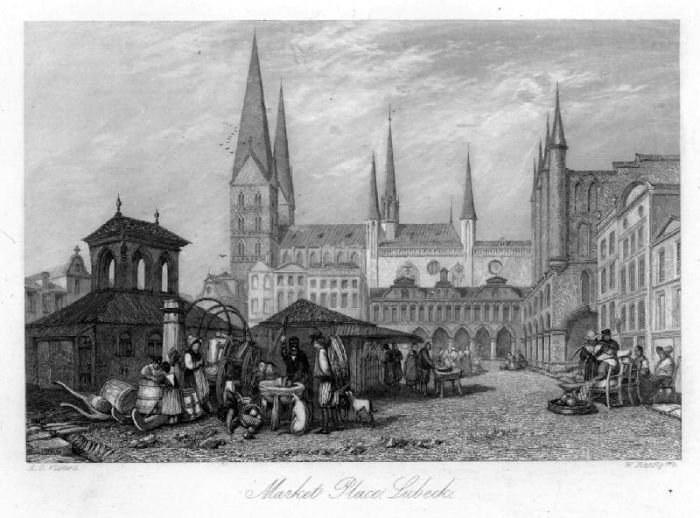 Market Place Lubeck. Blick über den belebten Marktplatz mit Butterbude (Kaak) auf Marienkirche und Rathaus.