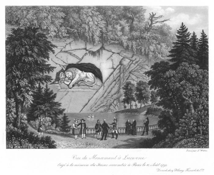 Vue du Monument à Lucerne. Ansicht mit zwei Mönchen, Militärs und ein Paar in Tracht.