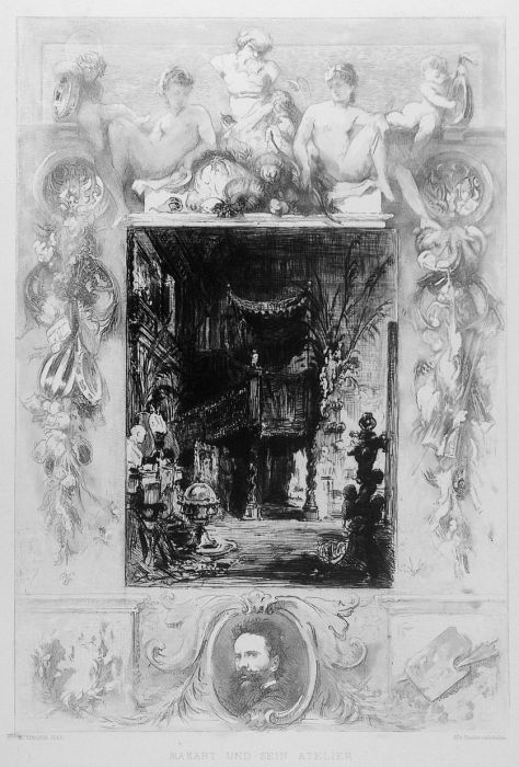 MAKART, Hans (1840 - 1884). - Makart und sein Atelier. Kleines Brustbild nach dreiviertellinks des Maler im Oval, darüber Blick in Atelier, umgeben von Allegorien, makartschen Frauenakten usw.