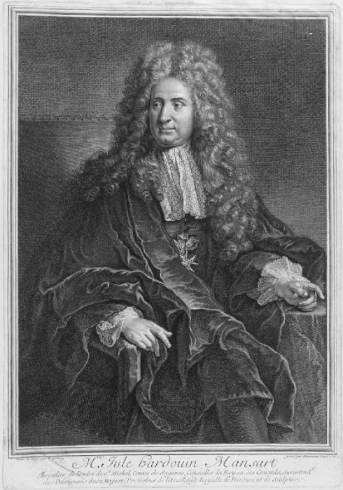 MANSART, Jules Hardouin (1646 - 1708). - Kniestück nach halblinks des französischen Architekten und Erbauers des Schlosses Versailles, sitzend in einem Fauteuil, unten Inschrift.