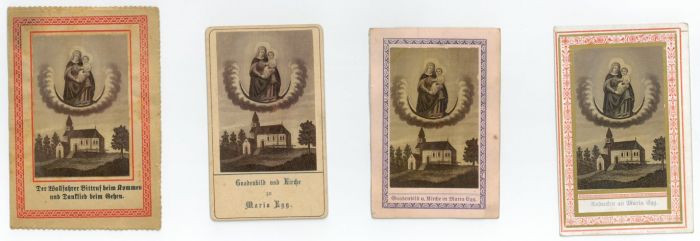 Die Verlagsangabe verso unten spiegelverkehrt. - Beiliegen: 1. "Gnadenbild u. Kirche in Maria Egg." Darstellung identisch, auf Karton mit violett gedruckter Umrandung, verso Kruzifix mit Umrahmung in Golddruck. 2. "Gnadenbild und Kirche zu Maria Egg." Darstellung identisch, auf Karton mit Einfassungslinie. 3. Darstellung identisch, mit rot gedruckter Umrandung. Titelbild eines vierseitigen Heftchens : "Der Wallahrer Bittruf beim Kommen und Danklied beim Gehen." Insgesamt 4 Darstellungen auf 4 Blättern.