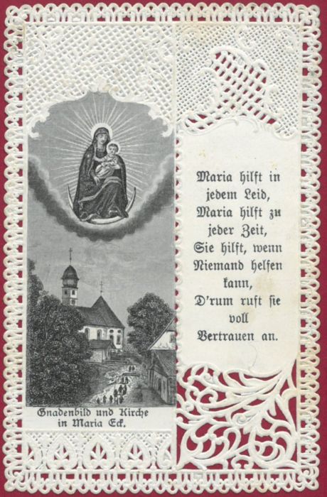 Gnadenbild und Kirche in Maria Eck. Ansicht der Wallfahrtskirche mit Wallfahrern, am Himmel das Gnadenbild, seitlich und verso Gebetstexte, in geprägter Spitzenumrahmung.