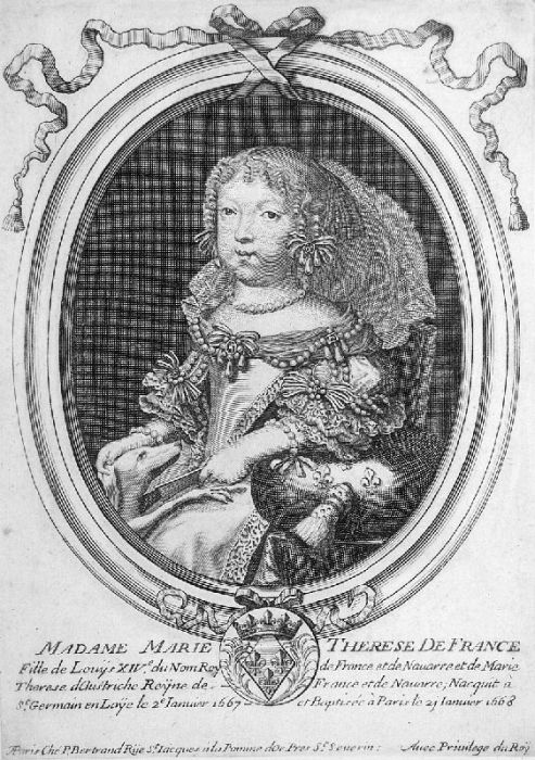 MARIA THERESIA, Prinzessin von Frankreich (geb. 1667). - Kniestück nach halblinks im Oval der jung verstorbenen Tochter König Ludwigs XIV., stehend in höfischer Kleidung mit geschlossenem Fächer, mit der Rechten einen Hund streichelnd