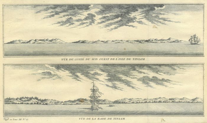 Vue du Costé du Sud Ouest de l'Isle de Tiniam und "Vue de la Rade de Tiniam". Zwei Inselansichten untereinander.