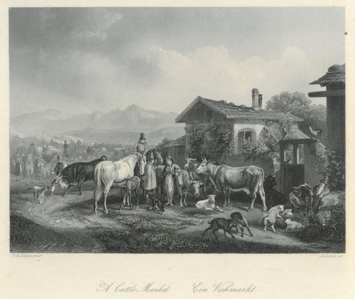 MARKT. - Viehmarkt. - Oberbayerische Viehhändler und Bauern mit zahlreichen Kühen, Schafen und Pferden vor Bauernhaus und Gebirgskulisse.