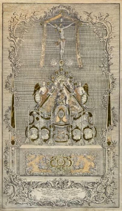 Thieme-Becker Bd. XXXI, S. 202f. - Äußerst seltene Darstellung des Gnadenbildes der Schmerzhaften Muttergottes in prachtvoller Aufmachung: Teile der Rocaille-Umrahmungen sind auf das Feinste ausgeschnitten und mit Seidengaze oder Goldpapier hinterlegt. Das Miesbacher Gnadenbild war Anziehungspunkt für bis zu 30 000 Wallfahrer pro Jahr. Der Kurfürstliche Kupferstecher Johann Michael Söckler (Augsburg 1744 - 1781 München) wurde bei Franz Xaver Jungwirth ausgebildet. - Die Seidenteile mit kleinen Fehlstellen, teilweise wenig gebräunt. In handgefertigtem Modellrahmen.