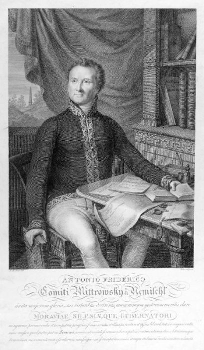 Andresen, Handb. Bd. I, Höfel 11, III (von III). - Auf dem Schreibtisch Urkunden, Karten usw. Mittrowsky von Mittrowitz und Nemysl, Herr auf Wiesenberg in Mähren, war Stadthauptmann von Wien (1799-1801) und Vizepräsident der niederösterreichischen Regierung (1802-1804). Als Oberster Kanzler (1830-1842) föderte er besonders das Straßen- und Eisenbahnwesen. - Geringe Läsuren im breiten Rand hinterlegt.