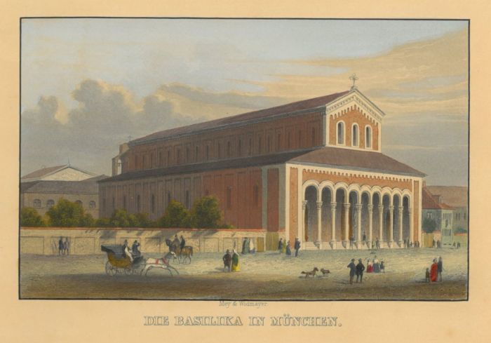 MÜNCHEN. - Basilika. - Basilika zum hl. Bonifacius mit Biedermeierstaffage im Vordergrund.