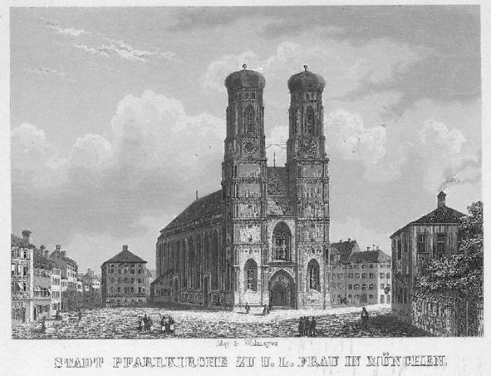 MÜNCHEN. - Frauenkirche. - Frauenkirche vom Hauptportal her gesehen mit umgebenden Häusern.