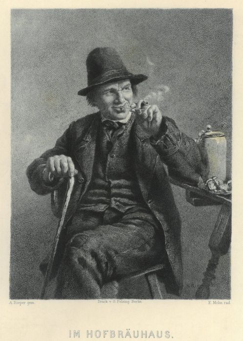 Im Hofbräuhaus. Ein Pfeife rauchender Herr, mit Hut und Stock, sitzt auf einem Stuhl und stützt sich mit dem Arm auf den Tisch, auf dem ein Maßkrug steht.