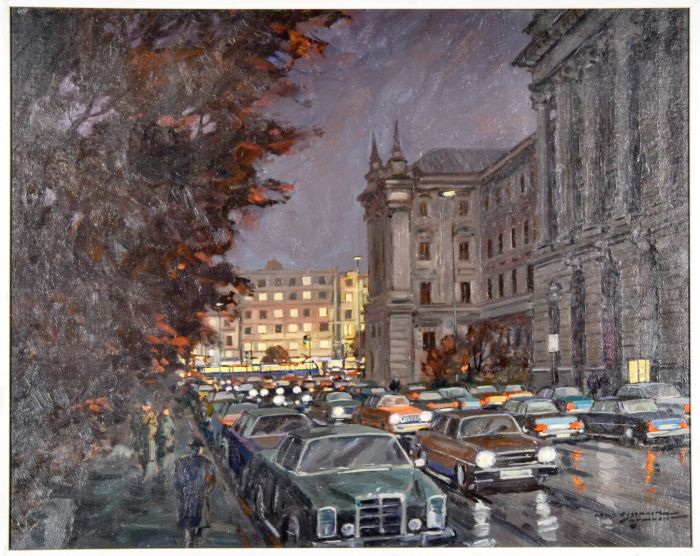 MÜNCHEN. - Justizpalast. - Justizpalast und Stachus. Blick von der abendlichen Elisenstrasse zum Stachus, rechts der Justizpalast, links Bäume des Alten Botanischen Gartens. Mit zahlreichen Autos belebt.
