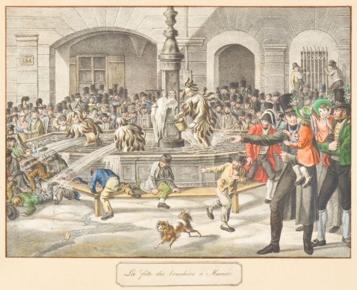 La fete des bouchers à Munic. (Das Brunnenspringen der Metzger in München). Fellbekleidete Metzgerjungen stehen im Fischbrunnen am Marienplatz und spritzen die zuschauende Menge mit großen Wassereimern nass.