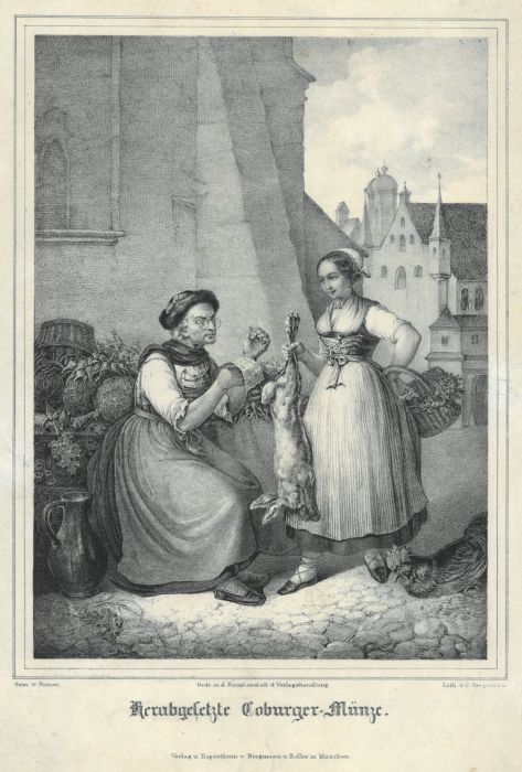 Herabgesetzte Coburger=Münze. Marktszene auf dem Jakobsplatz: Junges Mädchen in Tracht verhandelt mit einer älteren, sitzenden Händlerin über einen Hasen. Die Händlerin studiert einen Kurszettel mit Münzen, im Hintergrund Türme der Frauenkirche.