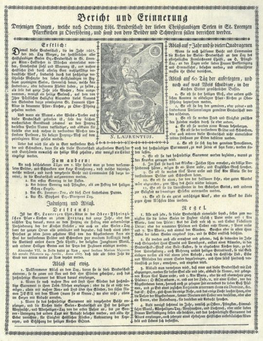 Bericht und Erinnerung Derjenigen Dingen, welche nach Ordnung Löbl. Bruderschaft der lieben Christgläubigen Seelen in St. Lorenzen Pfarrkirchen zu Oberföhring ... sollen verrichtet werden. Bruderschaftsbrief mit Heiligenbild.
